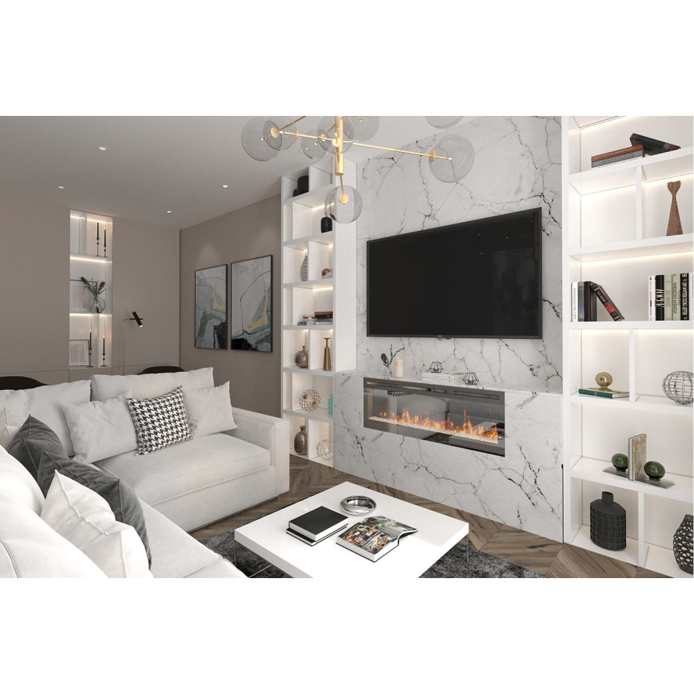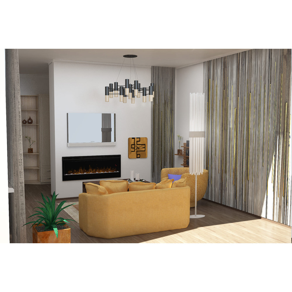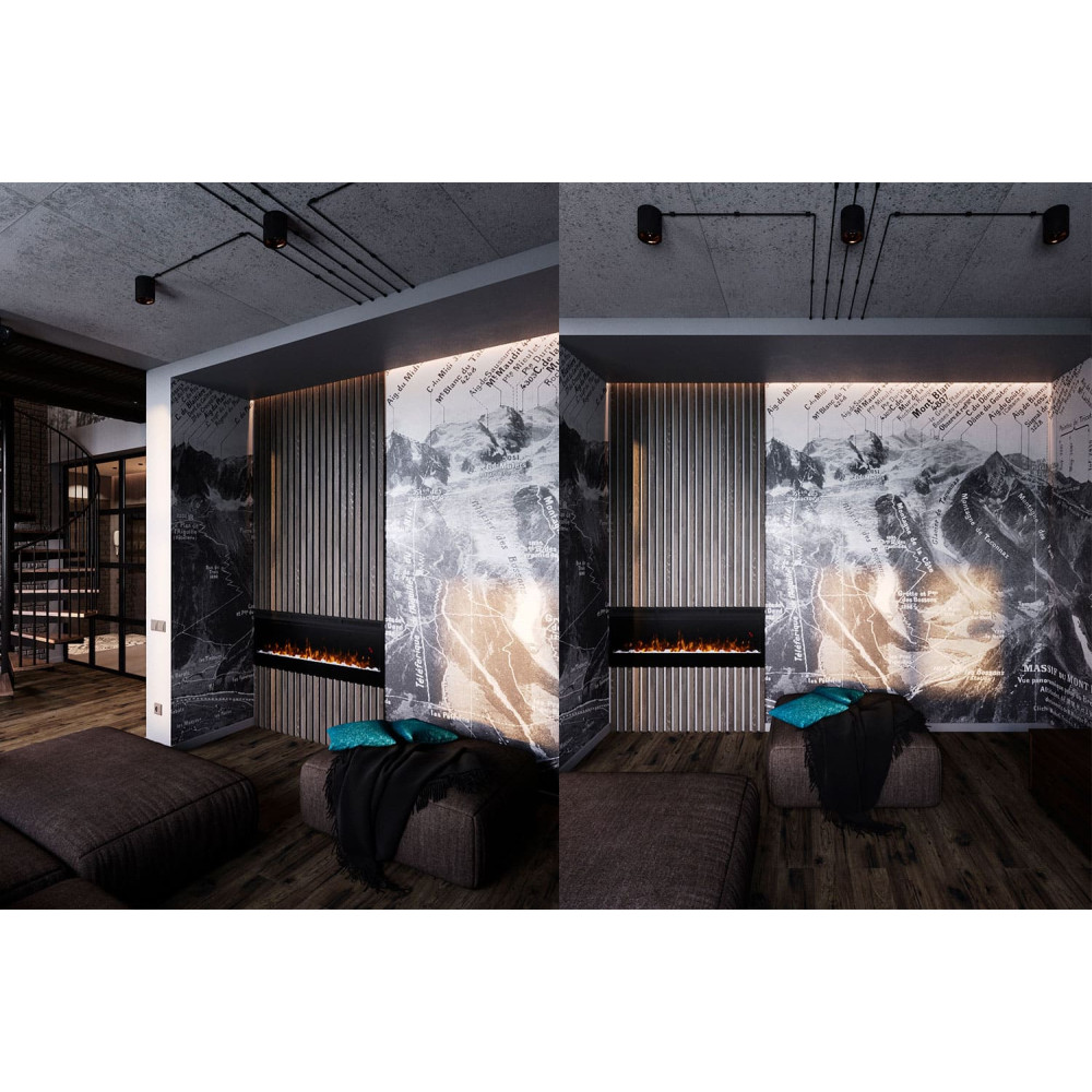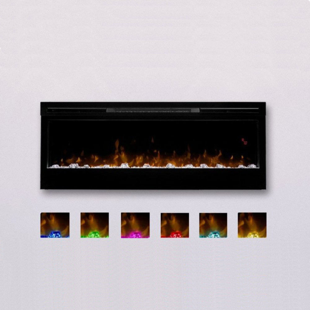 Dimplex Prism 50 LED настінний панорамний електроосередок з інноваційним ефектом горіння, який реалізований за допомогою технології Optiflame LED. Секрет ефекту імітації горіння полягає у наповнювачі вогнища. Це не звичні дрова і навіть каміння. Розробники Dimplex зробили крок далі, реалізувавши ідею наповнення топки акриловими кубиками, які імітують лід. Прозорі кубики «льоду» ідеально пропускають і ефектно відбивають різнобарвну гаму кольорів, створюючи ефект казкового чарівного полум'я. Такий камін дуже дивує та вражає.