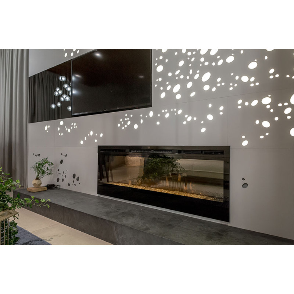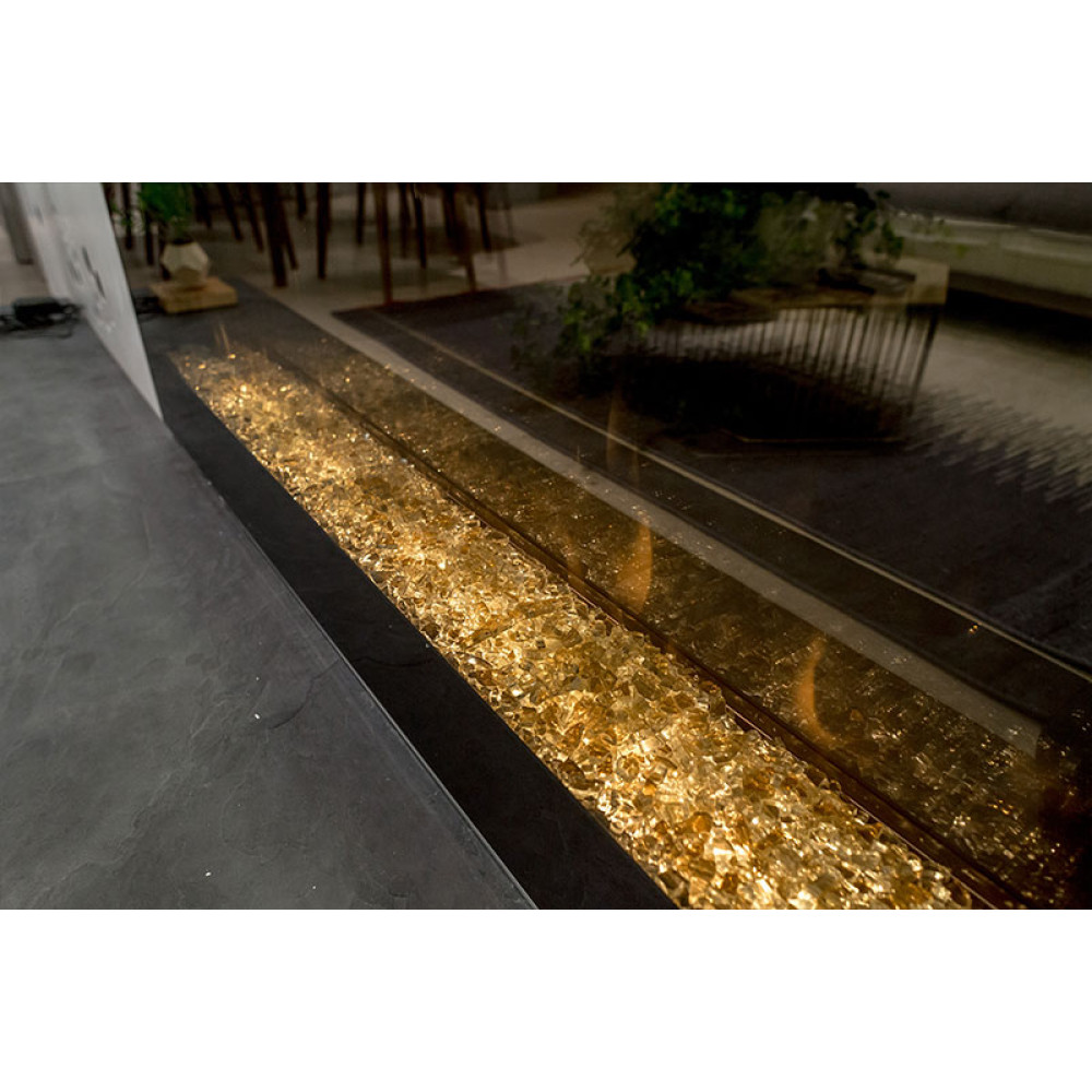 Зовнішня панель електрокаміна виготовлена із срібного та тонованого скла, яке сприяє особливому відображенню вогню від палаючих полін усередині осередку. Крім того, таке скло дозволило створити особливий оптичний ефект для більш реалістичного процесу електрогоріння.