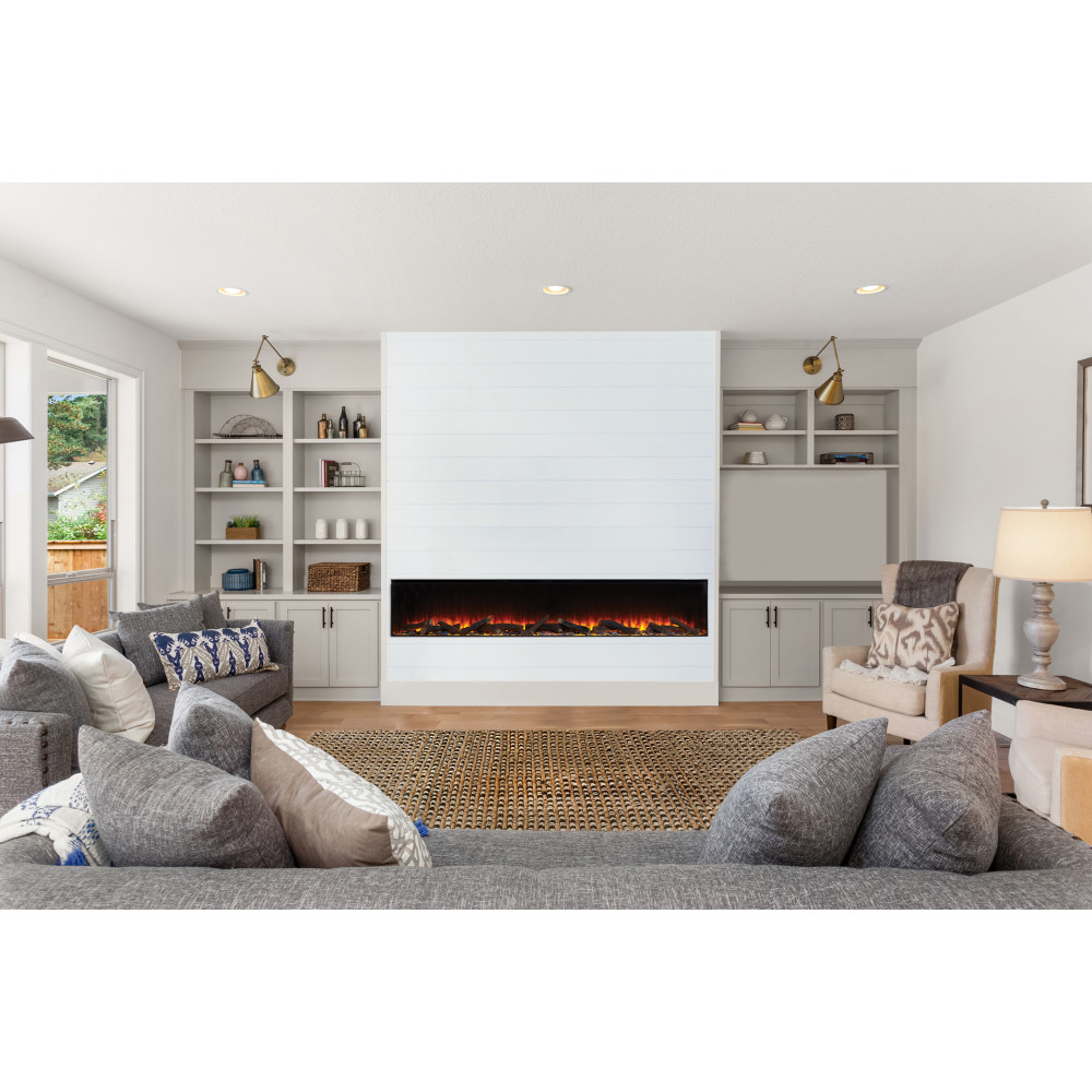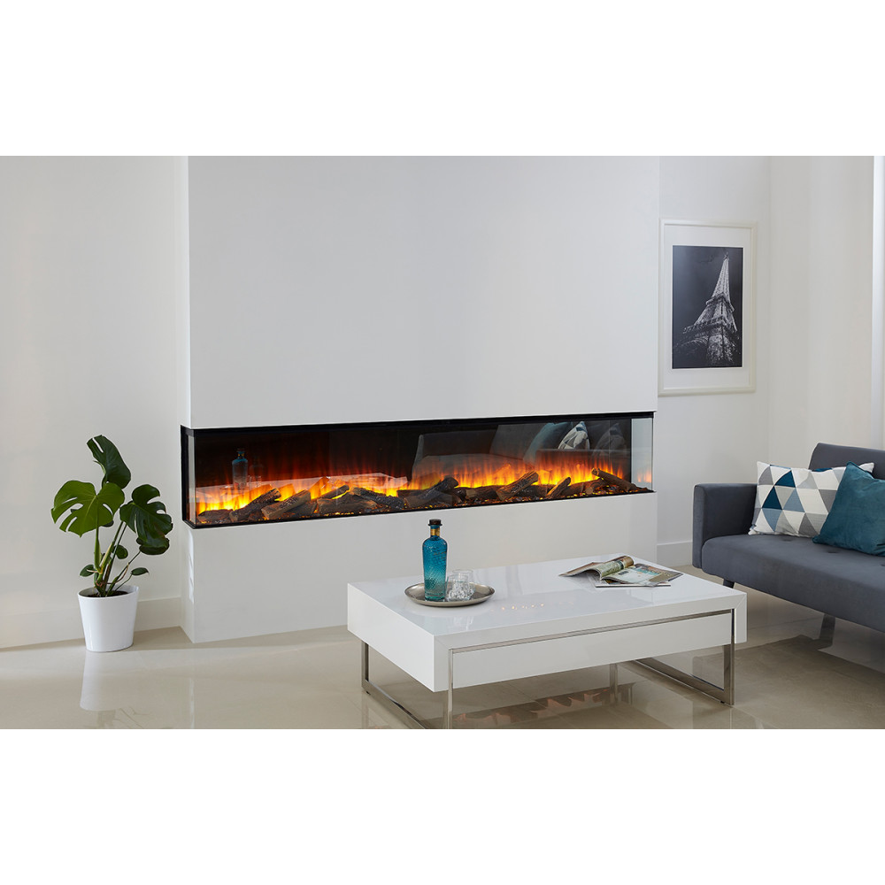Тристороннє вбудовування дає змогу встановити камін в нішу залишаючи ліву та праву скляні грані на виду. Ми показали вогонь (зліва) припіднятими дровами та вугіллям, щоб доповнити ефект вогоню. В даному дизайні використовується сучасний підхід до класичного оформлення.