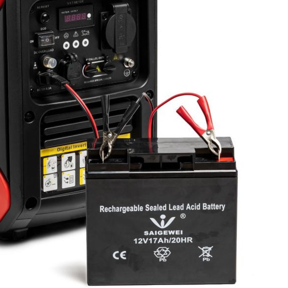 В данній моделі передбачені роз’єми: 1 розетку - 220/230V, 1 вихід – 12V/5 А - для заряду акумуляторів( в комплекті вилка з “крокодилами”), 2 виходи USB 1А та 2.1А - є можливість заряджати мобільні пристрої одразу від генератора. Також є виходи для паралельного з’єднання двох генераторів.