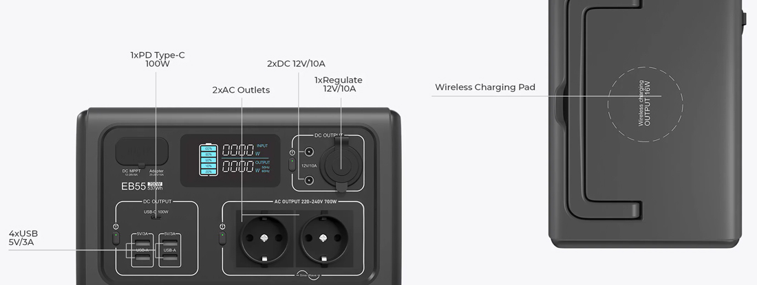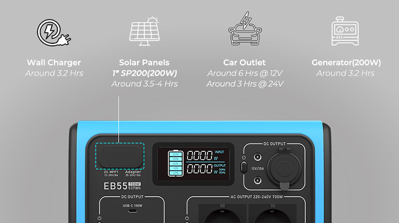 З 200Вт змінного струму + 200Вт фотоелектричного сонячного входу, EB55 приймає до 400Вт вхідної потужності, що дозволяє повністю зарядитися менш ніж за 2 години. Ви також можете отримати максимальну потужність 400Вт, використовуючи два адаптери змінного струму (другий адаптер необхідно придбати окремо).