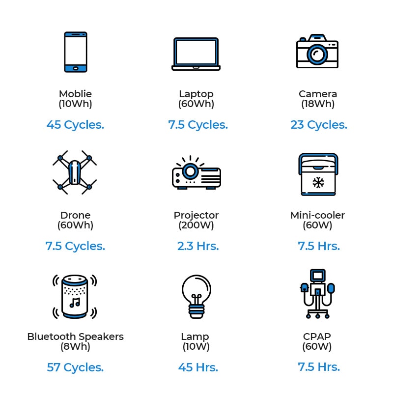 Подвійне швидке заряджання за допомогою двох адаптерів змінного струму одночасно, заряджання від мережі змінного струму та заряджання від фотоелектричного акумулятора або заряджання від мережі змінного струму та заряджання від автомобіля. Завдяки цим двом методам швидкого заряджання час заряджання може бути значно скорочено. Крім того, тривалість циклу заряджання/розряджання батареї становить 2500 разів, тому немає необхідності турбуватися про термін служби батареї через швидке заряджання.